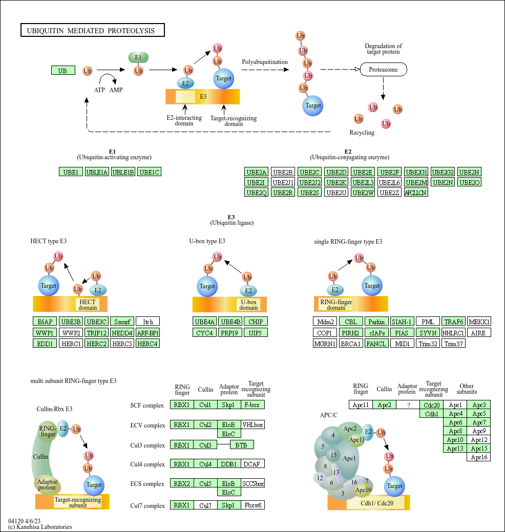 Protein ubiquitination plays an important role in eukaryotic cellular processes. It mainly functions as a signal for 26S proteasome dependent protein degradation. The addition of ubiquitin to proteins being degraded is performed by a reaction cascade consisting of three enzymes, named E1 (ubiquitin activating enzyme), E2 (ubiquitin conjugating enzyme), and E3 (ubiquitin ligase). Each E3 has specificity to its substrate, or proteins to be targeted by ubiquitination. Many E3s are discovered in eukaryotes and they are classified into four types: HECT type, U-box type, single RING-finger type, and multi-subunit RING-finger type. Multi-subunit RING-finger E3s are exemplified by cullin-Rbx E3s and APC/C. They consist of a RING-finger-containing subunit (RBX1 or RBX2) that functions to bind E2s, a scaffold-like cullin molecule, adaptor proteins, and a target recognizing subunit that binds substrates.
