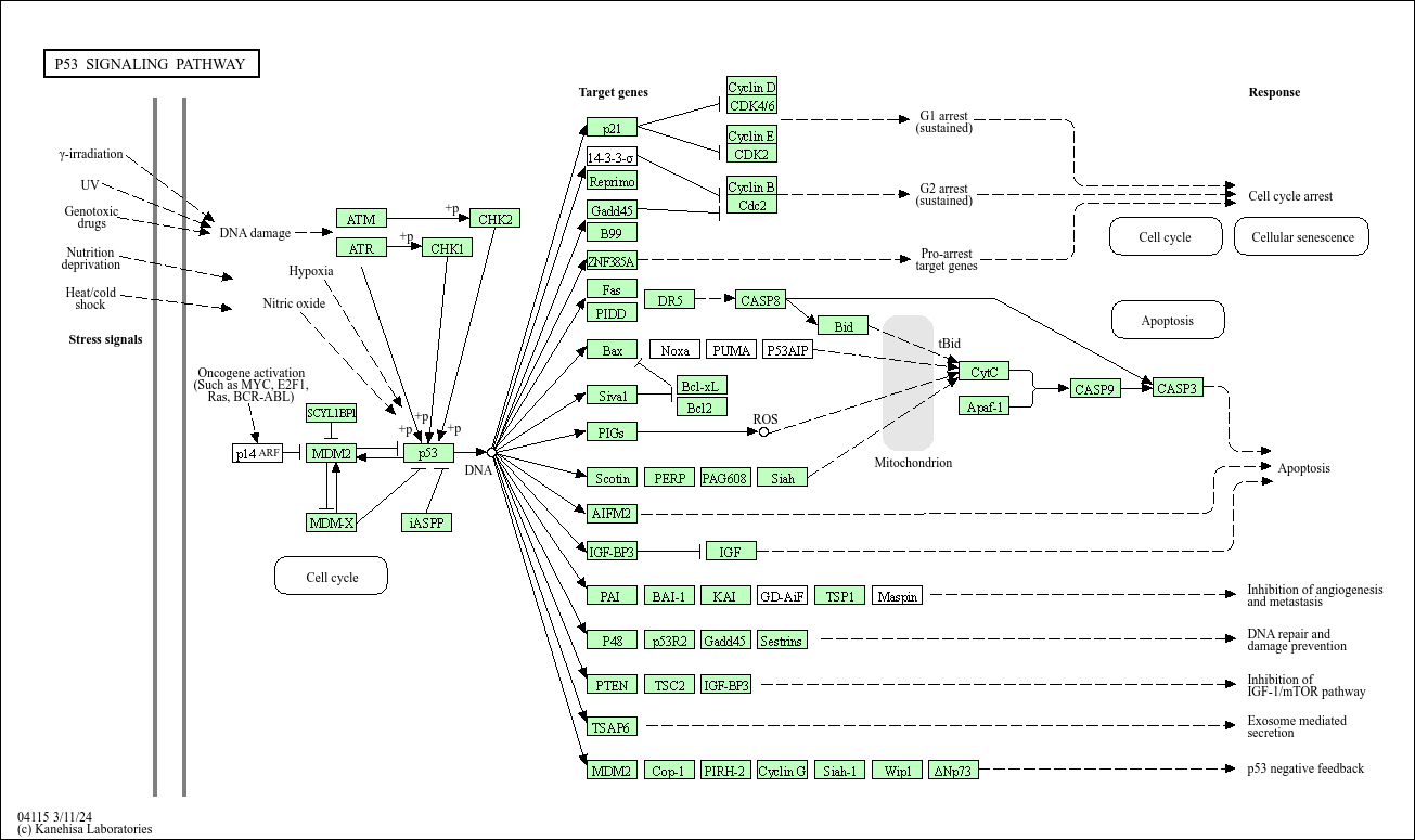 p53 activation is induced by a number of stress signals, including DNA damage, oxidative stress and activated oncogenes. The p53 protein is employed as a transcriptional activator of p53-regulated genes. This results in three major outputs; cell cycle arrest, cellular senescence or apoptosis. Other p53-regulated gene functions communicate with adjacent cells, repair the damaged DNA or set up positive and negative feedback loops that enhance or attenuate the functions of the p53 protein and integrate these stress responses with other signal transduction pathways.