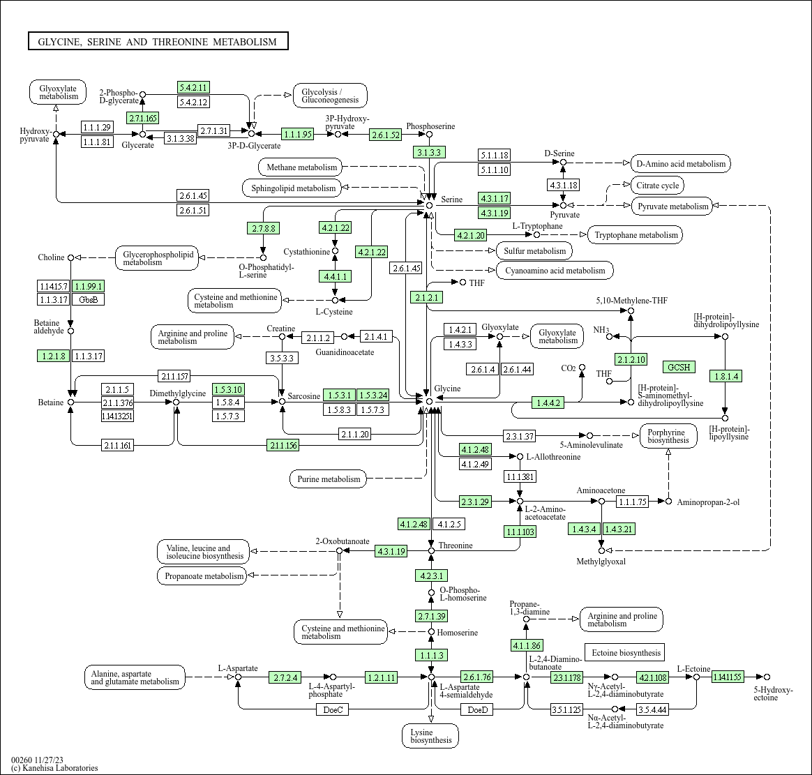 M00020], and glycine is derived from serine. Threonine is an essential amino acid, which animals cannot synthesize. In bacteria and plants, threonine is derived from aspartate [MD:
