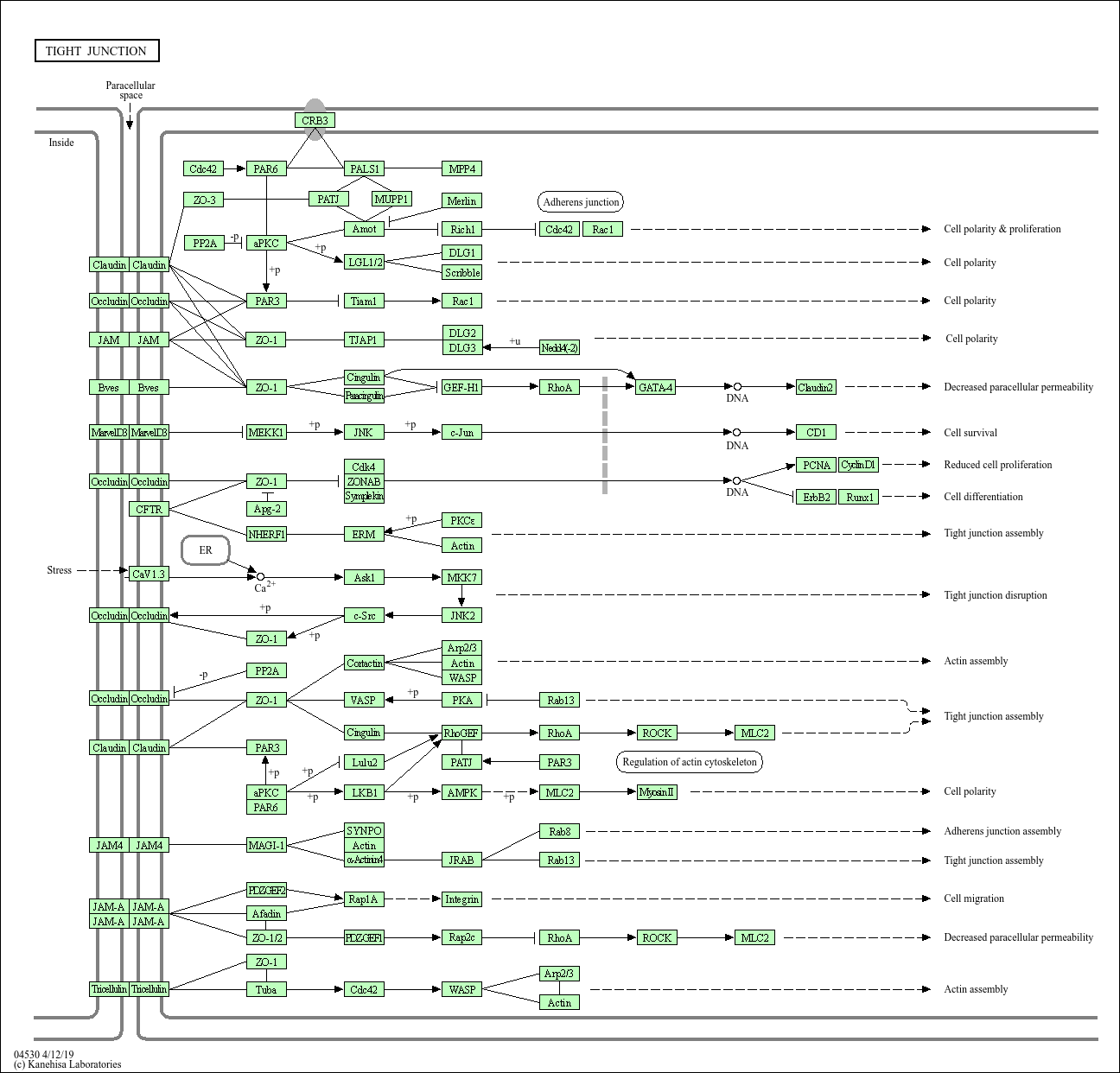 Tight junctions (TJs) are essential for establishing a selectively permeable barrier to diffusion through the paracellular space between neighboring cells. TJs are composed of at least three types of transmembrane protein -occludin, claudin and junctional adhesion molecules (JAMs)- and a cytoplasmic 'plaque' consisting of many different proteins that form large complexes. These are proposed to be involved in junction assembly, barrier regulation, cell polarity, gene transcription, and other pathways.