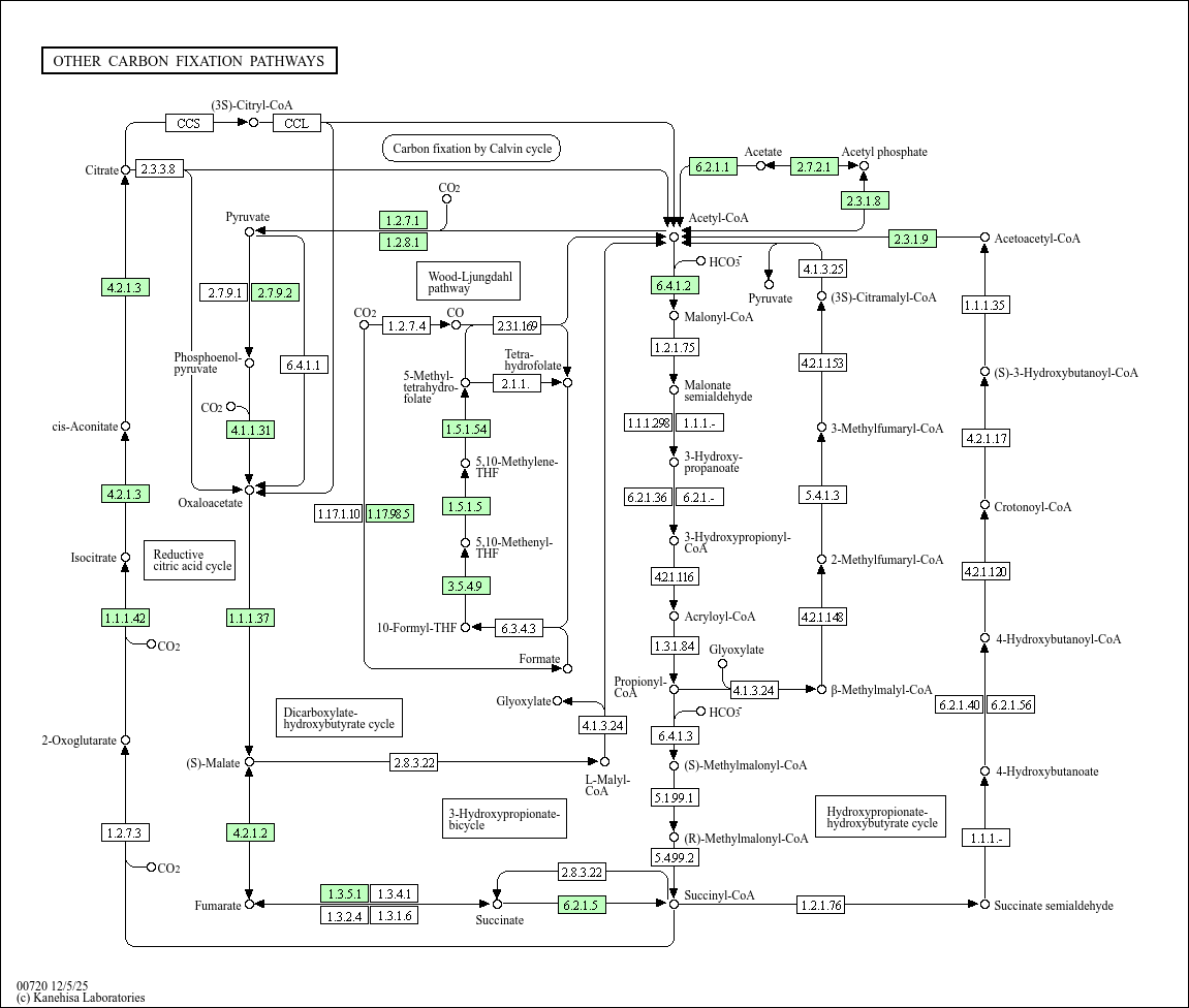 M00173] is found in microaerophiles and anaerobes, such as green sulfur bacteria. In one complete turn of this cycle, four molecules of CO2 are fixed by the enzymes that are sensitive to oxygen, resulting in the production of one molecule of oxaloacetate, which is itself an intermediate of the cycle. (ii) The reductive acetyl-CoA pathway (Wood-Ljungdahl pathway) [MD: