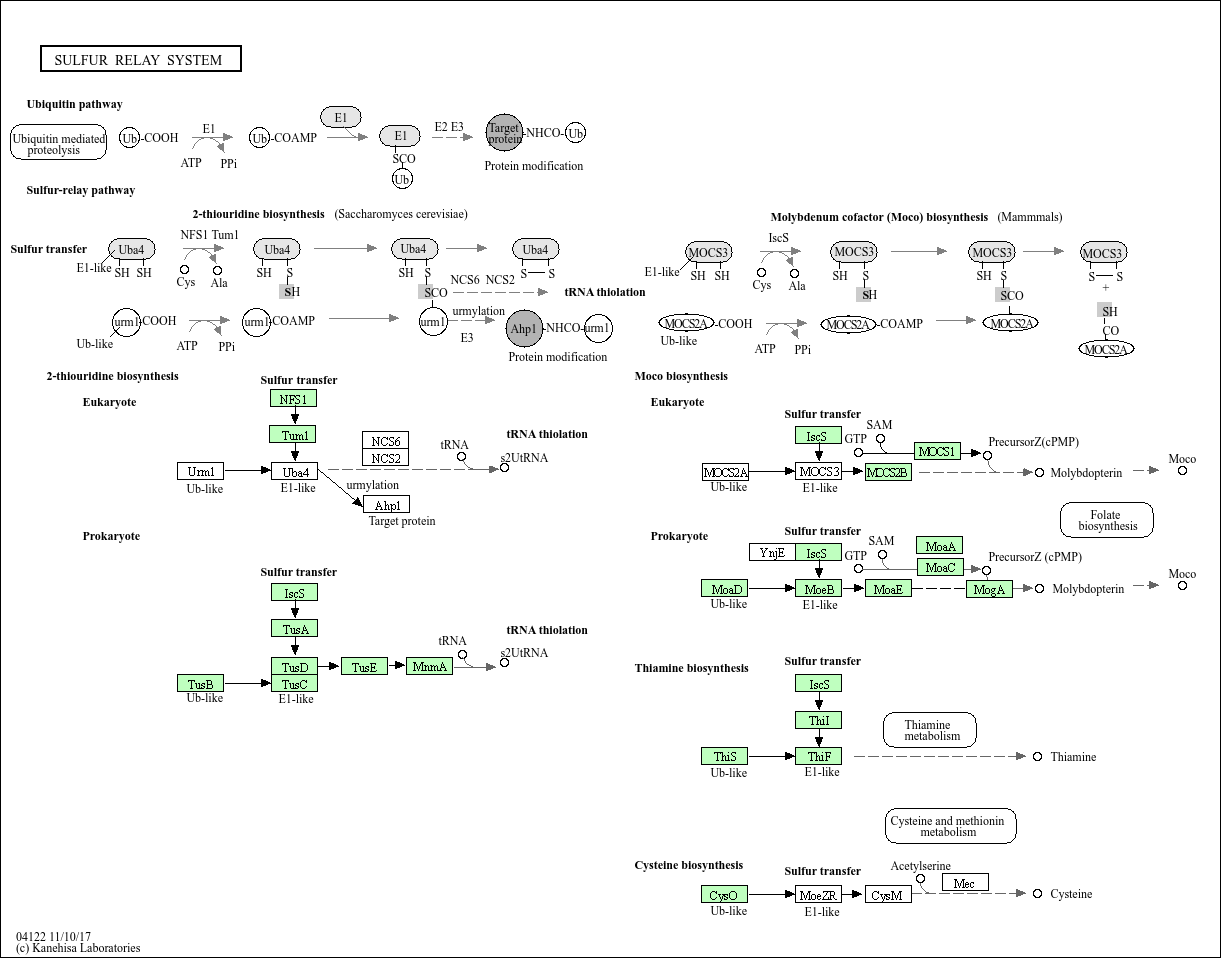 Ubiquitin and ubiquitin-like proteins (Ubls) are signalling messengers that control many cellular functions, such as cell proliferation, apoptosis, and DNA repair. It is suggested that Ub-protein modification evolved from prokaryotic sulfurtransfer systems. Molybdenum cofactor (Moco) and thiamin are sulfur-containing cofactors whose biosynthesis includes a key sulfur transfer step that uses unique sulfur carrier proteins, MoaD and ThiS. Ubiquitin, MoaD, and ThiS are all structurally related proteins whose C-termini are activated through adenylation by homologous E1-like enzymes. s2T biosynthesis may share similar chemistry with Moco and thiamin synthesis. In Saccharomyces cerevisiae, Urm1 and Uba4 function as part of a ubl protein conjugation system, though they have sequence homology to bacterial sulfur-transfer enzymes and the ability to function in sulfur transfer.