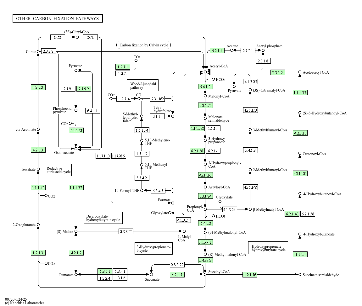 M00173] is found in microaerophiles and anaerobes, such as green sulfur bacteria. In one complete turn of this cycle, four molecules of CO2 are fixed by the enzymes that are sensitive to oxygen, resulting in the production of one molecule of oxaloacetate, which is itself an intermediate of the cycle. (ii) The reductive acetyl-CoA pathway (Wood-Ljungdahl pathway) [MD: