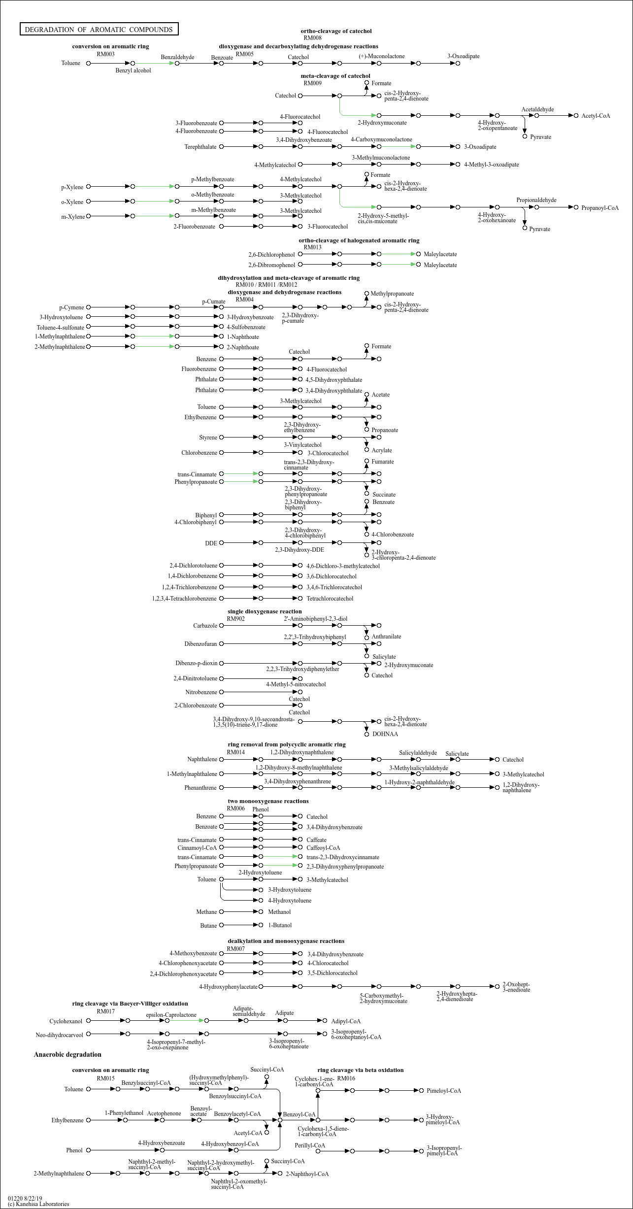Microorganisms are known to be capable of degrading diverse chemical substances including man-made chemicals in the environment that are mostly aromatic compounds. This diagram illustrates combination patterns of reaction modules for biodegradation of aromatic compounds, consisting of three main types of ring dihydroxylation modules, followed by meta- or ortho-cleavage modules, together with an optional preprocessing module for converting methyl group to carboxyl group on the aromatic ring.