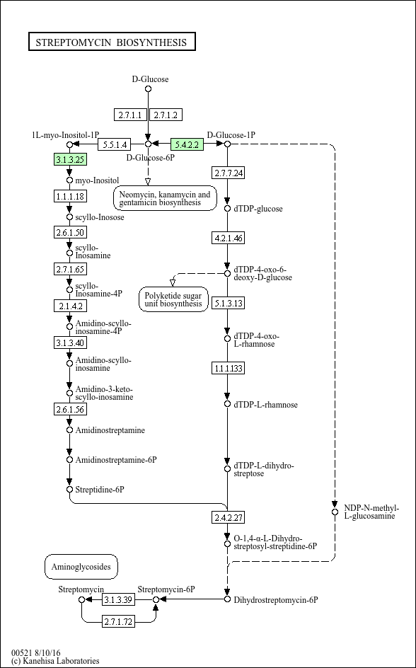Streptomycin is an aminocyclitol-aminoglycoside antibiotic produced by Streptomyces griseus. Streptomycin consists of aminocyclitol (streptidine), 6-deoxyhexose (streptose), and N-methyl-L-glucosamine moieties, which are formed by independent biosynthetic pathways. All of the moieties are derived from D-glucose. The streptidine moiety is synthesized via myo-inositol, which is then oxidized at C-1 and transaminated to give scyllo-inosamine. After phosphorylation, the compound is transamidinated by arginine. The same procedure is repeated at the C-3 position. The streptose moiety is made from D-glucose via a dTDP-glucose pathway. The exact biosynthetic route for the N-methyl-L-glucosamine moiety is unknown, though the biosynthetic gene cluster have been proposed.