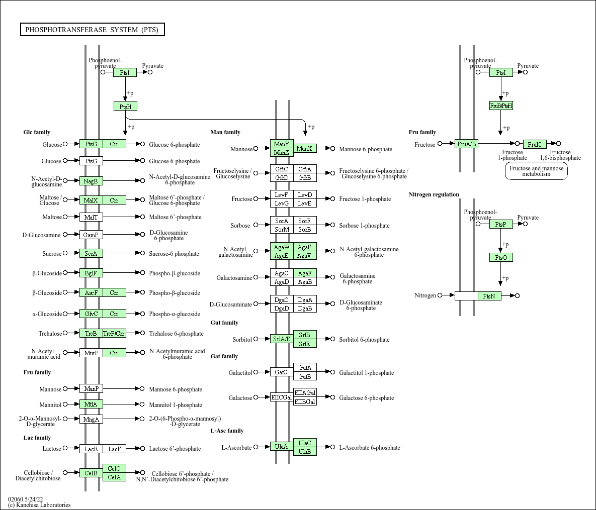 The phosphoenolpyruvate (PEP)-dependent phosphotransferase system (PTS) is a major mechanism used by bacteria for uptake of carbohydrates, particularly hexoses, hexitols, and disaccharides, where the source of energy is from PEP. The PTS consists of two general components, enzyme I (EI) and histidine phosphocarrier protein (HPr), and of membrane-bound sugar specific permeases (enzymes II). Each enzyme II (EII) complex consists of one or two hydrophobic integral membrane domains (domains C and D) and two hydrophilic domains (domains A and B). EII complexes may exist as distinct proteins or as a single multidomain protein. The PTS catalyzes the uptake of carbohydrates and their conversion into their respective phosphoesters during transport. There are four successive phosphoryl transfers in the PTS. Initial autophosphorylation of EI, using PEP as a substrate, is followed by transfer of the phosphoryl group from EI to HPr. EIIA catalyzes the self-phosphoryl transfer from HPr after which the phosphoryl group is transferred to histidine or cysteine residues of EIIB. The sugar is transported through the membrane-bound EIIC and is phosphorylated by the appropriate sugar-specific EIIB.