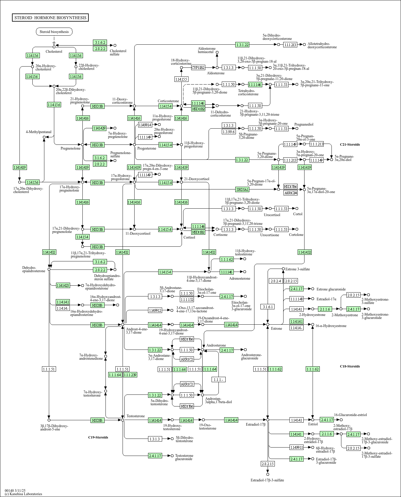 M00110]. The enzyme CYP17A1 is responsible for the 17,20 lyase and 17alpha-hydroxylase activities in respective pathways. (iii) Female hormones estrone and estradiol are formed from testosterone and 4-androstene-3,17-dione by oxidative removal of the C19 methyl group and subsequent aromatization of ring A. In addition to these three groups, recent studies show that there is another group, termed neurosteroids, synthesized in the brain rather than the peripheral endocrine gland.