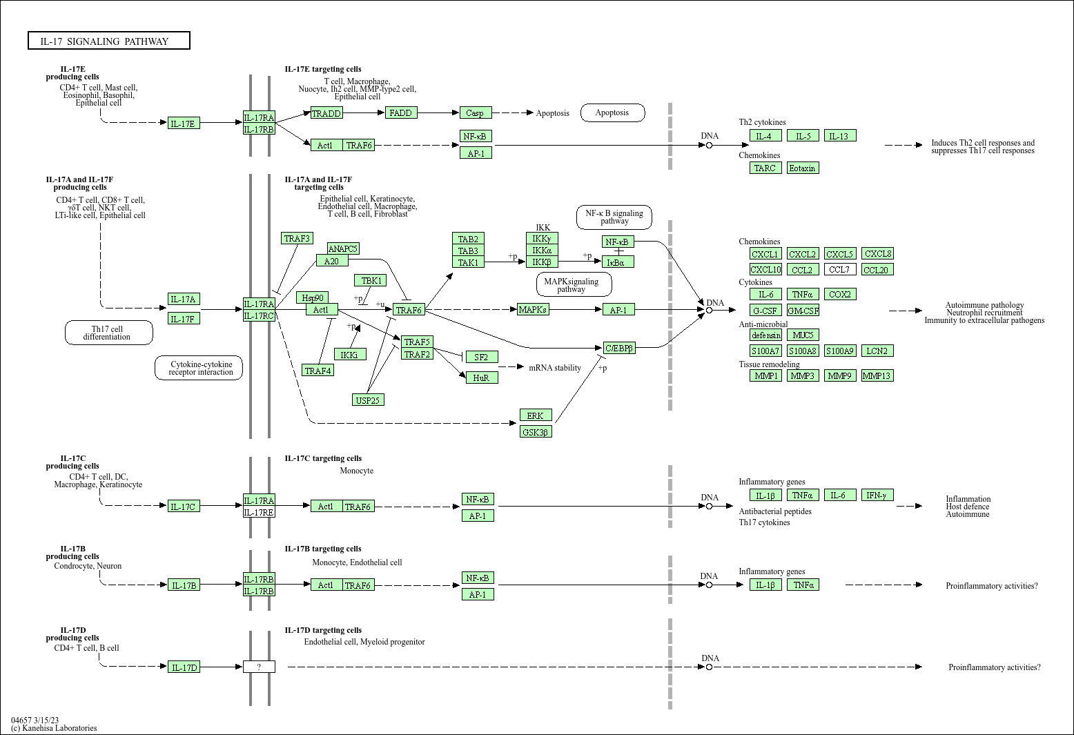 The interleukin 17 (IL-17) family, a subset of cytokines consisting of IL-17A-F, plays crucial roles in both acute and chronic inflammatory responses. IL-17A, the hallmark cytokine of the newly defined T helper 17 (TH17) cell subset, has important roles in protecting the host against extracellular pathogens, but also promotes inflammatory pathology in autoimmune disease, whereas IL-17F is mainly involved in mucosal host defense mechanisms. IL-17E (IL-25) is an amplifier of Th2 immune responses. IL-17C has biological functions similar to those of IL-17A. The functions of IL-17B and IL-17D remain largely elusive. The IL-17 family signals via their correspondent receptors and activates downstream pathways that include NF-kappaB, MAPKs and C/EBPs to induce the expression of antimicrobial peptides, cytokines and chemokines. The receptor proximal adaptor Act1 (an NF-kappaB activator 1) is considered as the master mediator in IL-17A signaling. It is likely that Act1 is a common signal adaptor also shared by other members mediated signalings in this family.