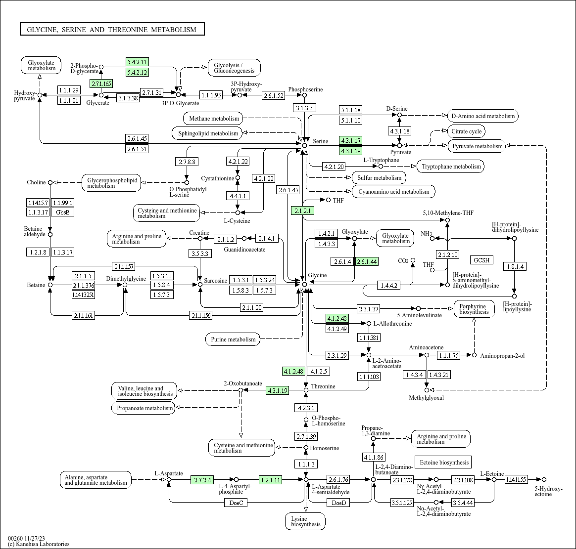 M00020], and glycine is derived from serine. Threonine is an essential amino acid, which animals cannot synthesize. In bacteria and plants, threonine is derived from aspartate [MD: