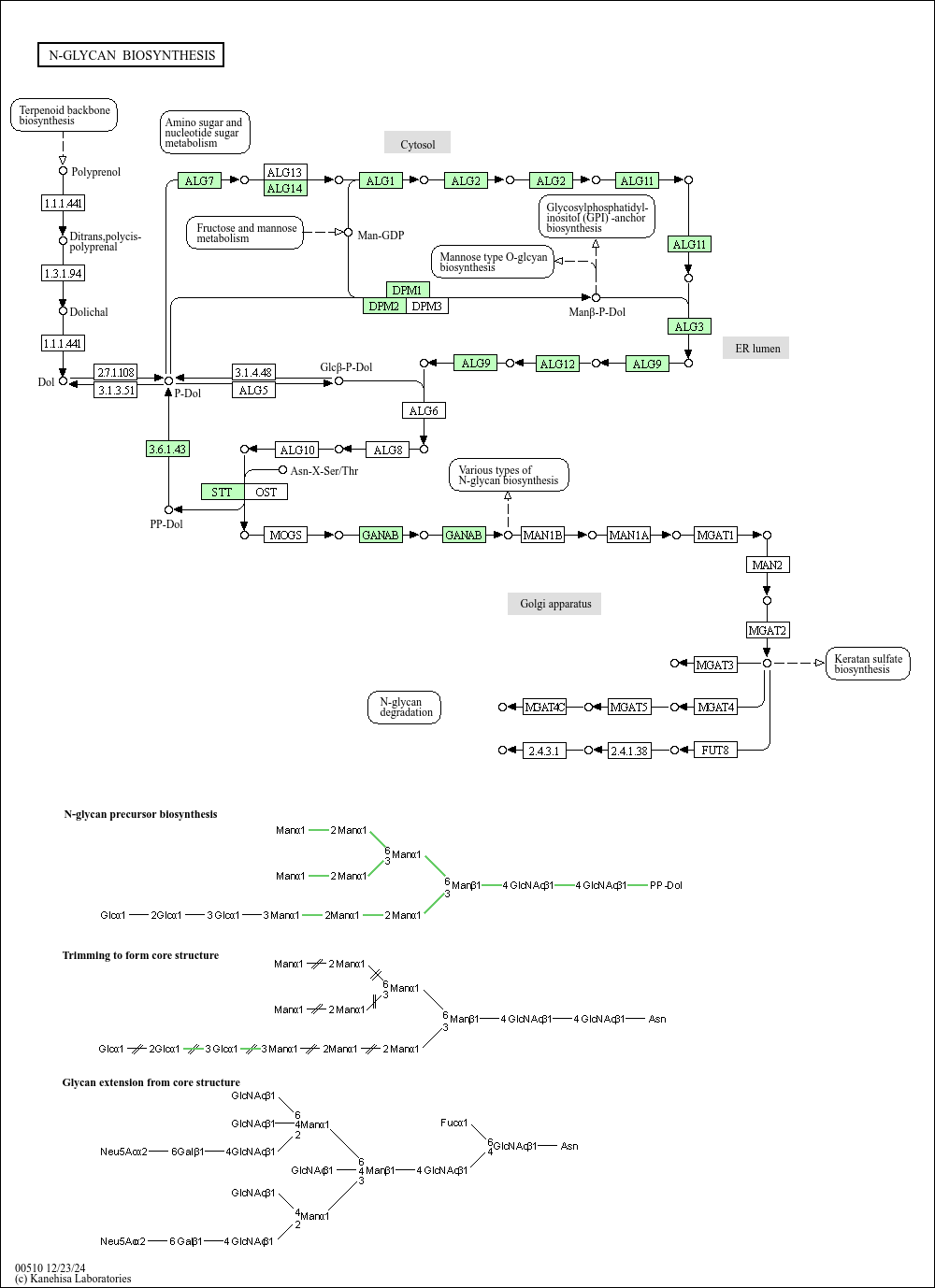 M00055], the N-glycan precursor is attached by the OST (oligosaccharyltransferase) complex to the polypeptide chain that is being synthesized and translocated through the ER membrane. The protein-bound N-glycan precursor is subsequently trimmed, extended, and modified in the ER and Golgi by a complex series of reactions catalyzed by membrane-bound glycosidases and glycosyltransferases. N-glycans thus synthesized are classified into three types: high-mannose type, complex type, and hybrid type. Defects in N-glycan biosynthesis lead to a variety of human diseases known as congenital disorders of glycosylation [DS: