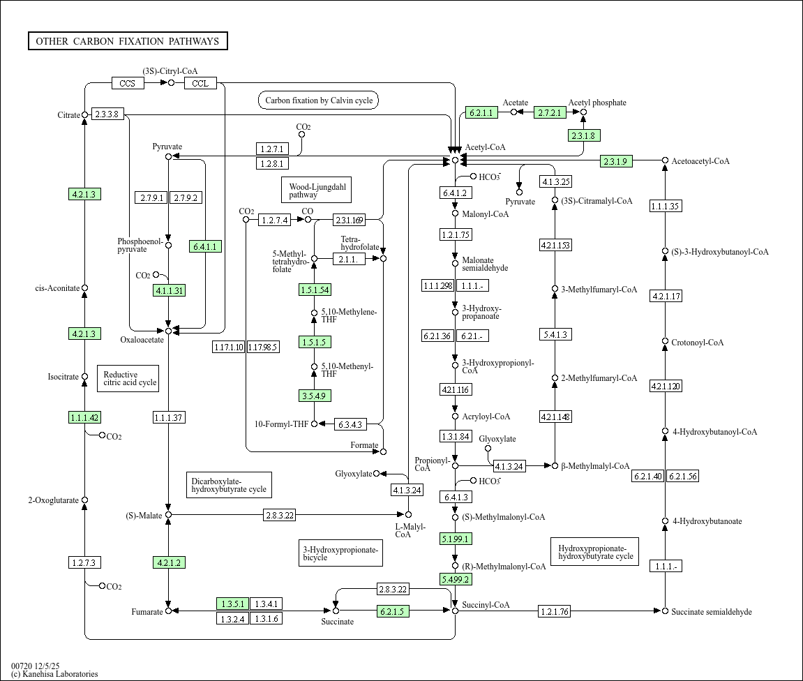 M00165]. There are, at least, five additional carbon fixation pathways known to exist in autotrophic bacteria and archaea, which differ in reducing compounds, energy source, and oxygen sensitivity of enzymes. (i) The reductive citric acid cycle (Arnon-Buchanan cycle) [MD: