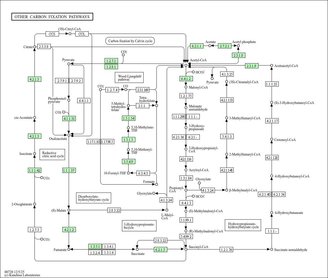 M00165]. There are, at least, five additional carbon fixation pathways known to exist in autotrophic bacteria and archaea, which differ in reducing compounds, energy source, and oxygen sensitivity of enzymes. (i) The reductive citric acid cycle (Arnon-Buchanan cycle) [MD:
