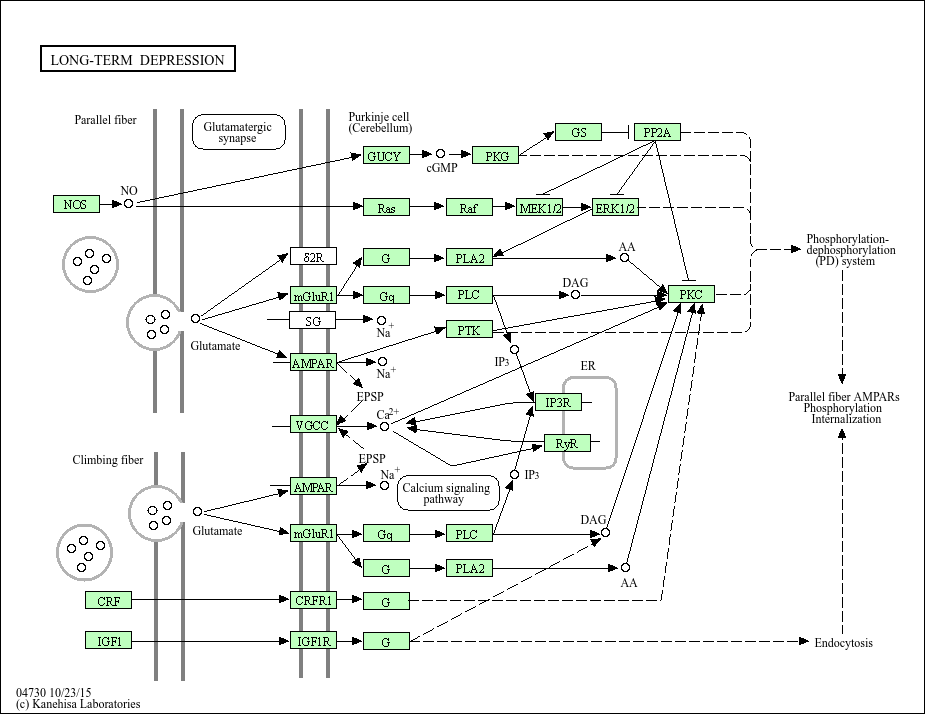 Cerebellar long-term depression (LTD), thought to be a molecular and cellular basis for cerebellar learning, is a process involving a decrease in the synaptic strength between parallel fiber (PF) and Purkinje cells (PCs) induced by the conjunctive activation of PFs and climbing fiber (CF). Multiple signal transduction pathways have been shown to be involved in this process. Activation of PFs terminating on spines in dendritic branchlets leads to glutamate release and activation of both AMPA and mGluRs. Activation of CFs, which make multiple synaptic contacts on proximal dendrites, also via AMPA receptors, opens voltage-gated calcium channels (VGCCs) and causes a generalized influx of calcium. These cellular signals, generated from two different synaptic origins, trigger a cascade of events culminating in a phosphorylation-dependent, long-term reduction in AMPA receptor sensitivity at the PF-PC synapse. This may take place either through receptor internalization and/or through receptor desensitization.