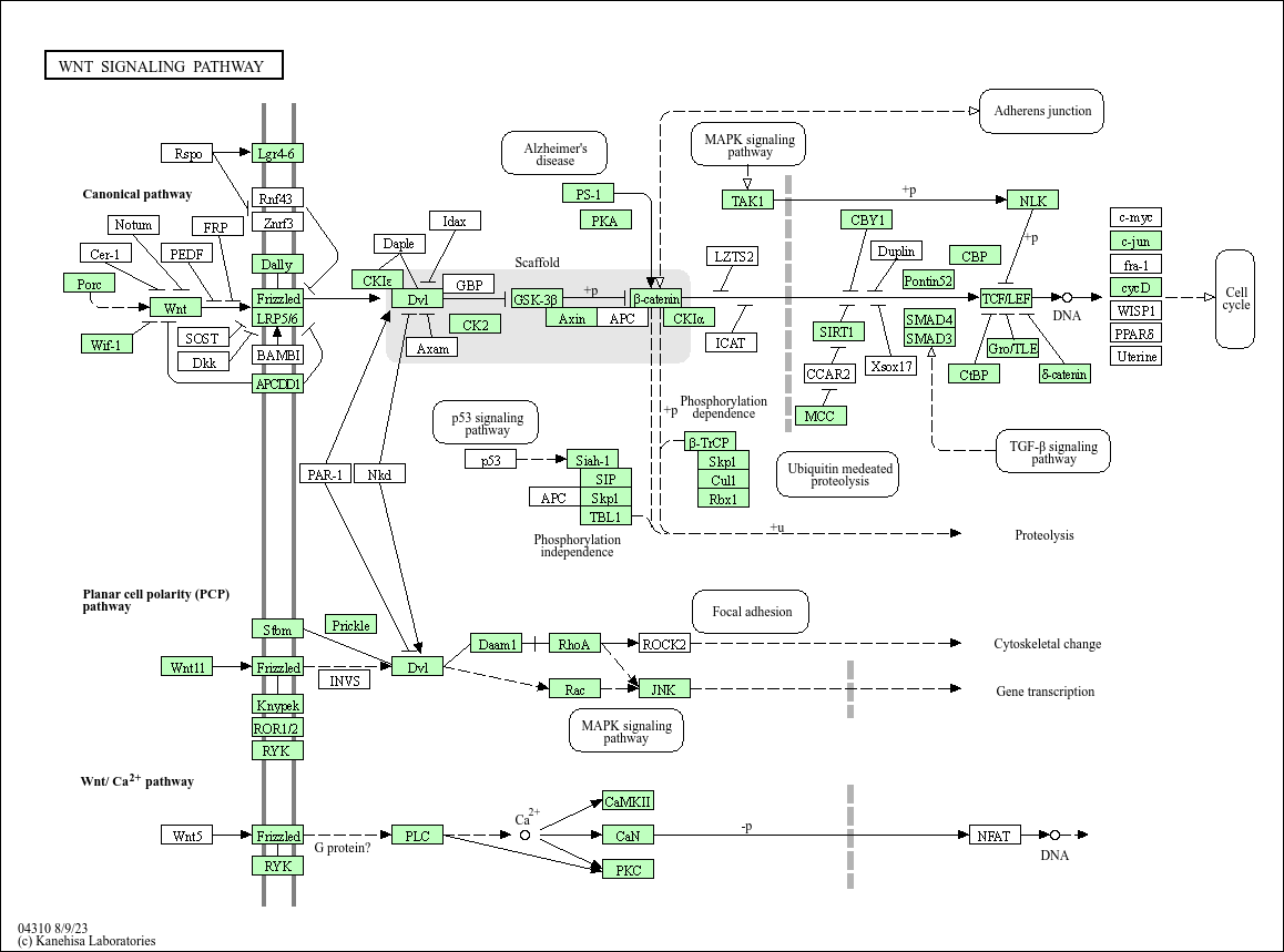 Wnt proteins are secreted morphogens that are required for basic developmental processes, such as cell-fate specification, progenitor-cell proliferation and the control of asymmetric cell division, in many different species and organs. There are at least three different Wnt pathways: the canonical pathway, the planar cell polarity (PCP) pathway and the Wnt/Ca2+ pathway. In the canonical Wnt pathway, the major effect of Wnt ligand binding to its receptor is the stabilization of cytoplasmic beta-catenin through inhibition of the bea-catenin degradation complex. Beta-catenin is then free to enter the nucleus and activate Wnt-regulated genes through its interaction with TCF (T-cell factor) family transcription factors and concomitant recruitment of coactivators. Planar cell polarity (PCP) signaling leads to the activation of the small GTPases RHOA (RAS homologue gene-family member A) and RAC1, which activate the stress kinase JNK (Jun N-terminal kinase) and ROCK (RHO-associated coiled-coil-containing protein kinase 1) and leads to remodelling of the cytoskeleton and changes in cell adhesion and motility. WNT-Ca2+ signalling is mediated through G proteins and phospholipases and leads to transient increases in cytoplasmic free calcium that subsequently activate the kinase PKC (protein kinase C) and CAMKII (calcium calmodulin mediated kinase II) and the phosphatase calcineurin.