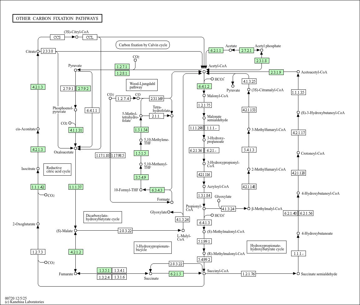 M00165]. There are, at least, five additional carbon fixation pathways known to exist in autotrophic bacteria and archaea, which differ in reducing compounds, energy source, and oxygen sensitivity of enzymes. (i) The reductive citric acid cycle (Arnon-Buchanan cycle) [MD: