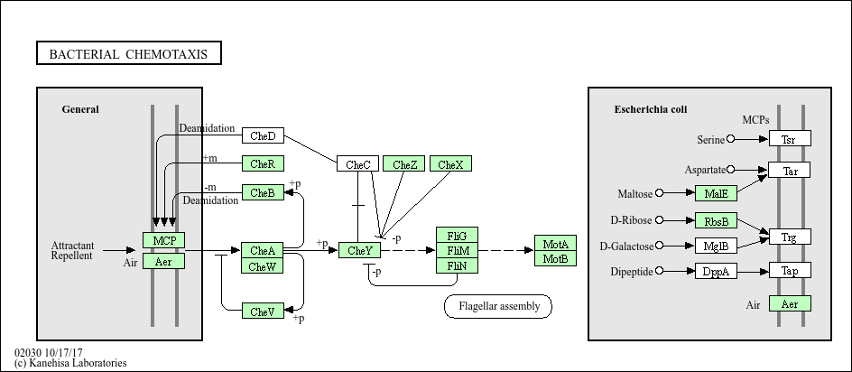Chemotaxis is the process by which cells sense chemical gradients in their environment and then move towards more favorable conditions. In chemotaxis, events at the receptors control autophosphorylation of the CheA histidine kinase, and the phosphohistidine is the substrate for the response regulator CheY, which catalyzes the transfer of the phosphoryl group to a conserved aspartate. The resulting CheY-P can interact with the switch mechanism in the motor. This interaction causes a change in behavior, such as in direction or speed of rotation of flagella.