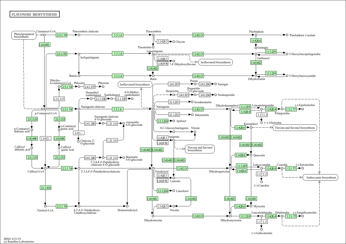 Flavonoids are a major class of plant secondary metabolites that serves a multitude of functions including pigments and antioxidant activity. Flavonoids are synthesized from phenylpropanoid derivatives by condensation with malonyl-CoA. For example, condensation of p-coumaroyl-CoA (C6-C3) with three malonyl-CoA (C3) molecules results in naringenin chalcone with a diphenylpropane (C6-C3-C6) unit, which is converted to naringenin with the flavone (2-phenylchromen-4-one) backbone by conjugate ring closure. These and further modifications yield a variety of structural forms including chalcones, flavanones, dihyroflavonols, and flavans, anthocyanins, flavones and flavonols, and isoflavonoids.