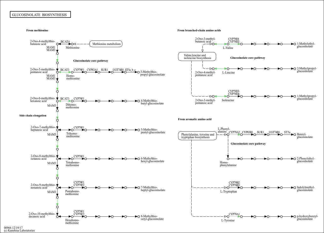 Glucosinolates are biologically active secondary metabolites found in Brassicaceae (mustard family) and related families.These compounds are genetically variable within plant species and used as natural pesticides, such as against insect herbivores. All glucosinolates share a common structure consisting of a beta-thioglucose moiety, a sulfonated oxime moiety, and a variable aglycone side chain derived from an alpha-amino acid. Genes encoding glucosinolate biosynthetic enzymes have been identified in Arabidopsis thaliana by genetic polymorphisms and loss-of-function mutations. This map shows examples of side chain elongation in methionine-derived glucosinolates and the core pathway for biosynthesis of glucosinolates from amino acids.